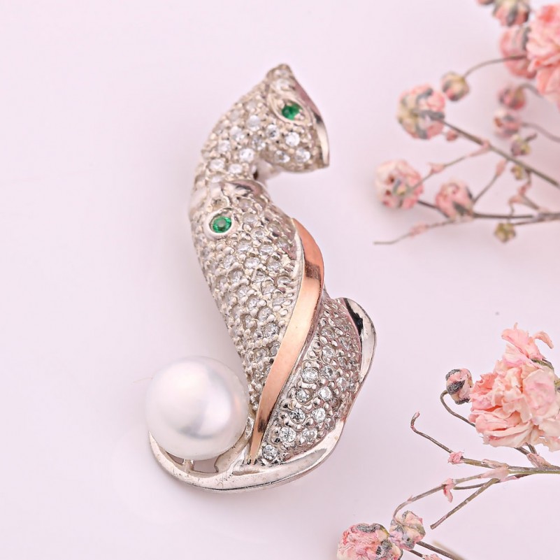 Серебряная брошь с золотом Фианиты Жемчуг. Родированное покрытие! Очаровательная брошь из серебра 925 пробы и золота 375 пробы, украшенная сверкающими разноцветными фианитами и природным, искусственно выращенном, жемчугом, растущим в привычных для себя условиях!. Серебряные броши с фианитами не только подчеркивают красоту и изящество их владелицы, но и служат прекрасным дополнением к любому наряду. Это украшение несет миссию дарить самые светлые и высокие чувства своей обладательнице!