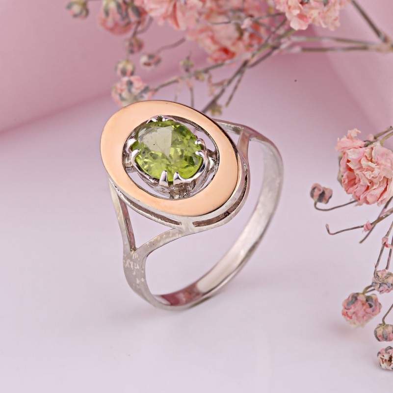Серебряный гарнитур с золотом Хризолит. Очаровательный серебряный гарнитур, состоящий из серег и кольца, со вставками необыкновенно красивого хризолита. Серебро 925 пробы и золото 375. Прекрасное романтичное дополнение к Вашему образу! Родированное покрытие!
