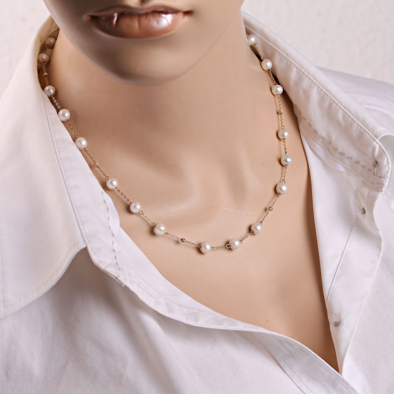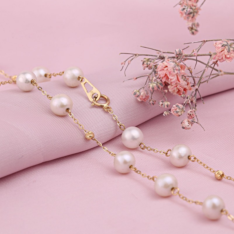 Элегантное и женственное колье со вставками природного жемчуга, искуственно выращенного в привычных для себя условиях, на цепочке якорного плетения из желтого золота 585 пробы и золотыми шариками с алмазной огранкой.