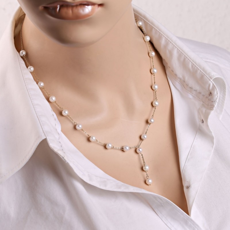 Элегантное и женственное колье со вставками природного жемчуга, искуственно выращенного в привычных для себя условиях, на цепочке якорного плетения из желтого золота 585 пробы с алмазной огранкой.