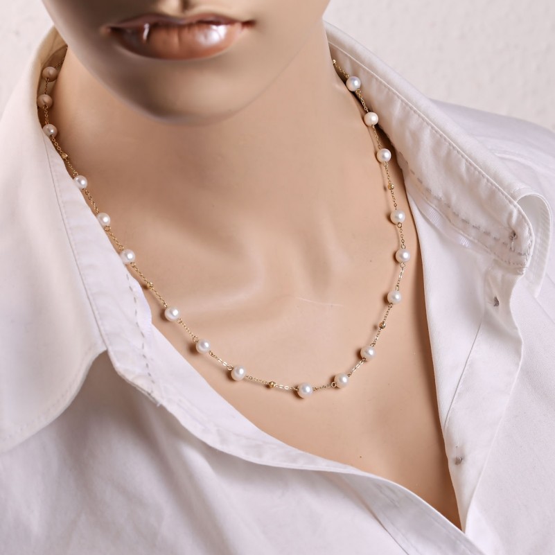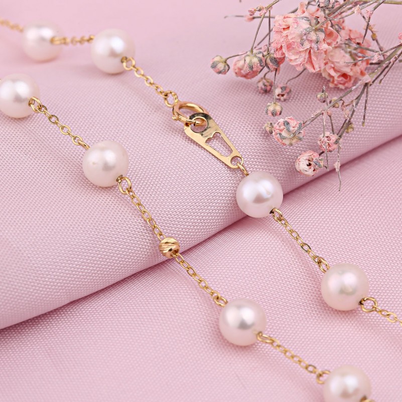 Элегантное и женственное колье со вставками природного жемчуга, искуственно выращенного в привычных для себя условиях, на цепочке якорного плетения из желтого золота 585 пробы и золотыми шариками с алмазной огранкой.
