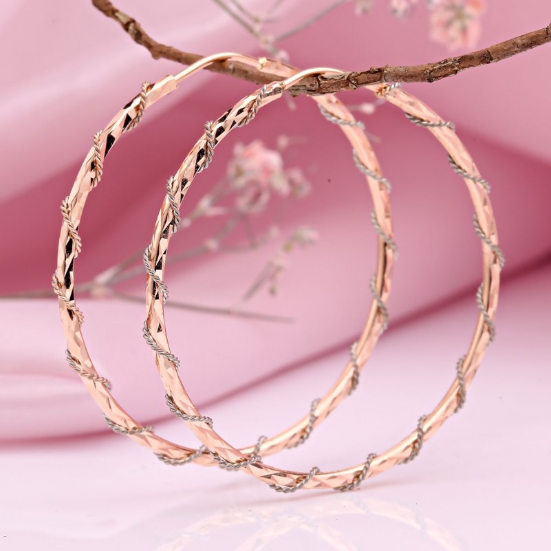 Русское золото 585 пробы Золотые серьги конго 48 мм. Элегантные серьги-кольца, известные как креолы, из красного золота 585 пробы с алмазной огранкой и акцентами из белого золота подчеркнут ваши женственность и грацию.