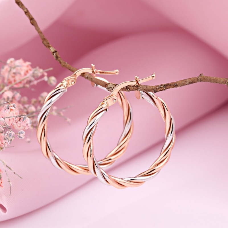 Русское золото 585 пробы Золотые серьги конго 25 мм биколор. Элегантные серьги-кольца, известные как креолы, из красного золота 585 пробы с акцентами из белого золота подчеркнут ваши женственность и грацию.