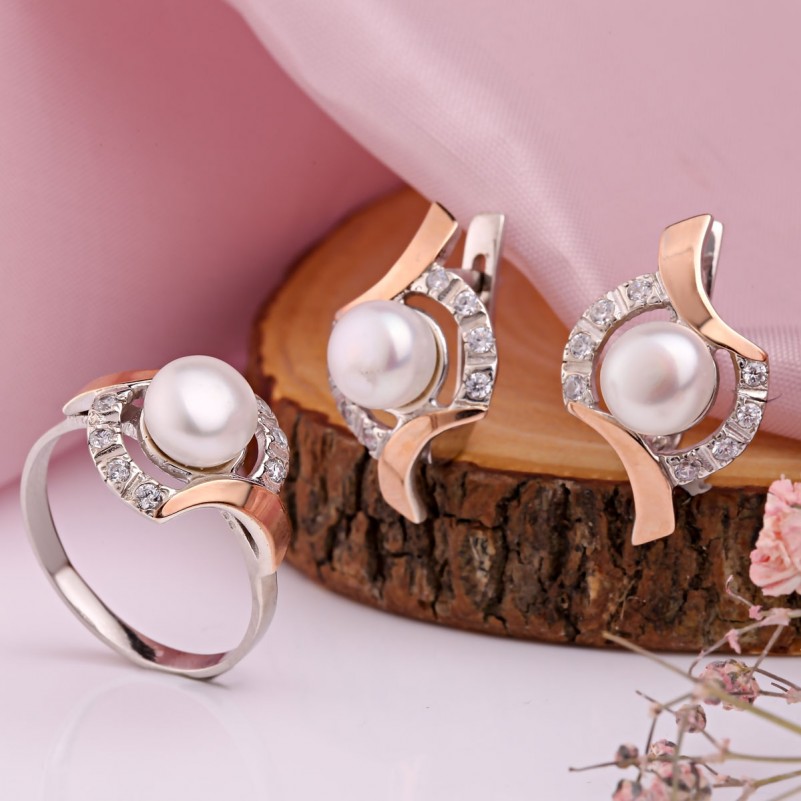 Серебряные серьги с золотом Фианит Жемчуг. Шикарные серьги из родированного серебра 925 пробы с акцетами из красного золота 375 пробы со вставками сверкающих фианитов и природным, искусственно выращенном, жемчугом, растущим в привычных для себя условиях! Прекрасный подарок или возможность порадовать себя.