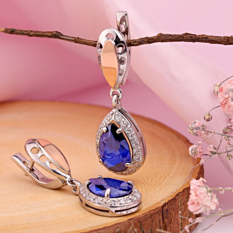 Серебряные серьги-подвески с золотом Фианит. Шикарные серьги-подвески из серебра 925 пробы с акцетами из красного золота 375 пробы со вставками сверкающих фианитов и крупным синим фианитом! Прекрасный подарок или возможность порадовать себя.