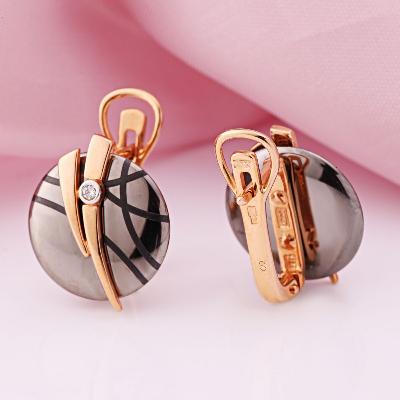 Родированное покрытие! Изящные, стильные серьги из красного золота 585 пробы c акцентами из белого золота со вставками очаровательных бриллиантов и керамикой с рисунком. Идеальное завершение имиджа женщины, которая любит менять образы - это cерьги с бриллиантами из красного золота 585 пробы. Такое изделие, выразительное и изысканное, подходит женщинам любого возраста, которые ценят интересный дизайн и безупречность камней.