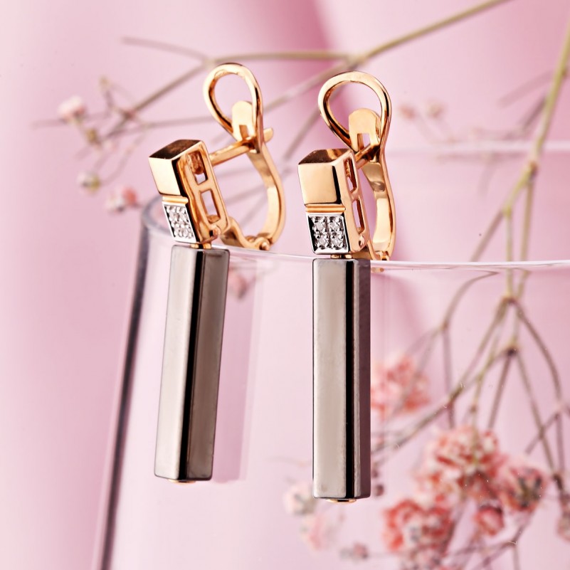 Родированное покрытие! Изящные, стильные серьги-подвески из белого и красного золота 585 пробы со вставками очаровательных бриллиантов и керамикой металлик. Идеальное завершение имиджа женщины, которая любит менять образы - это cерьги с бриллиантами из красного золота 585 пробы. Такое изделие, выразительное и изысканное, подходит женщинам любого возраста, которые ценят интересный дизайн и безупречность камней.