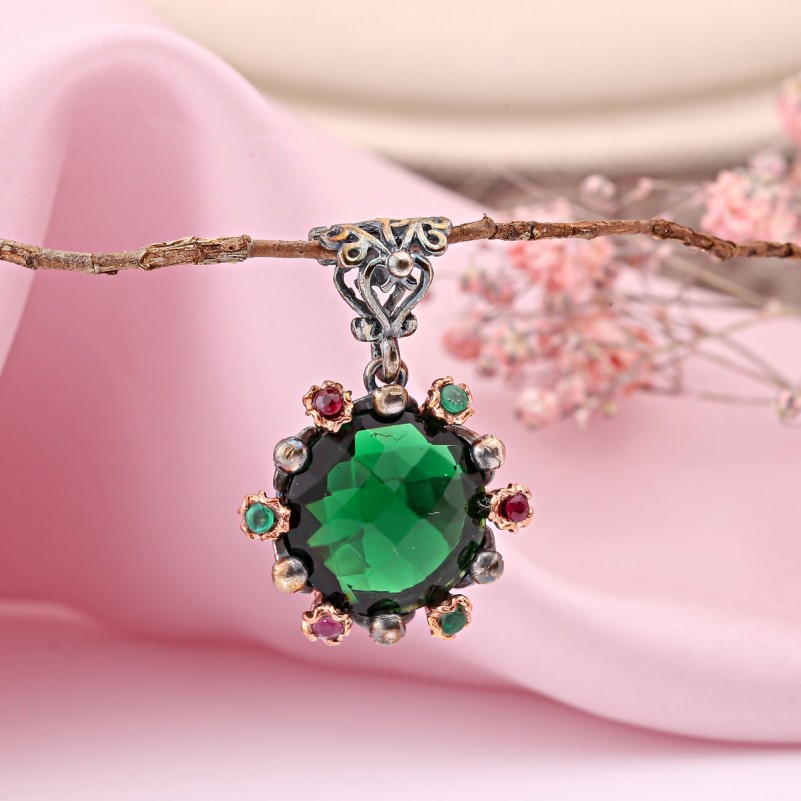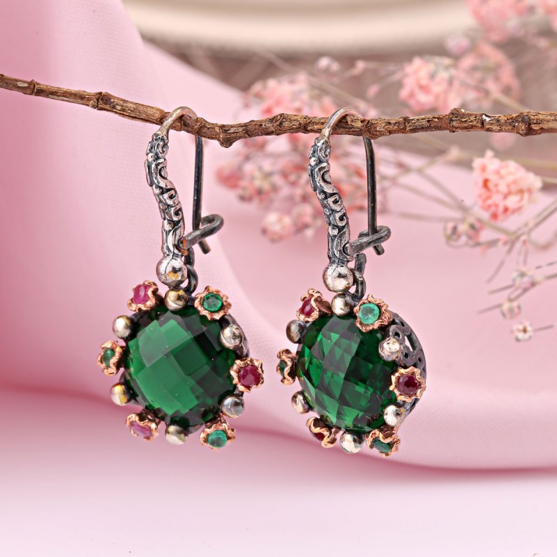 Гарнитур из серебра 925 пробы Фианиты Изумруд Рубин. Шикарный этнический гарнитур в османском стиле ручной работы из чернёного серебра 925 пробы с крупной вставкой зелёного фианита в бронзовом обрамлении, изумрудов и рубинов.