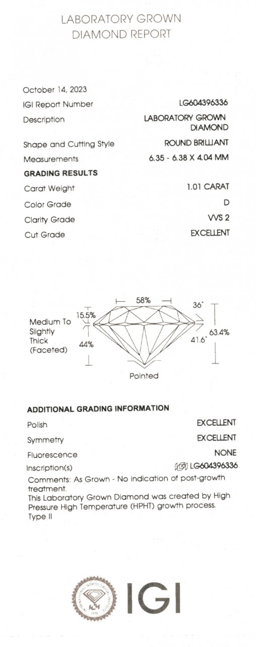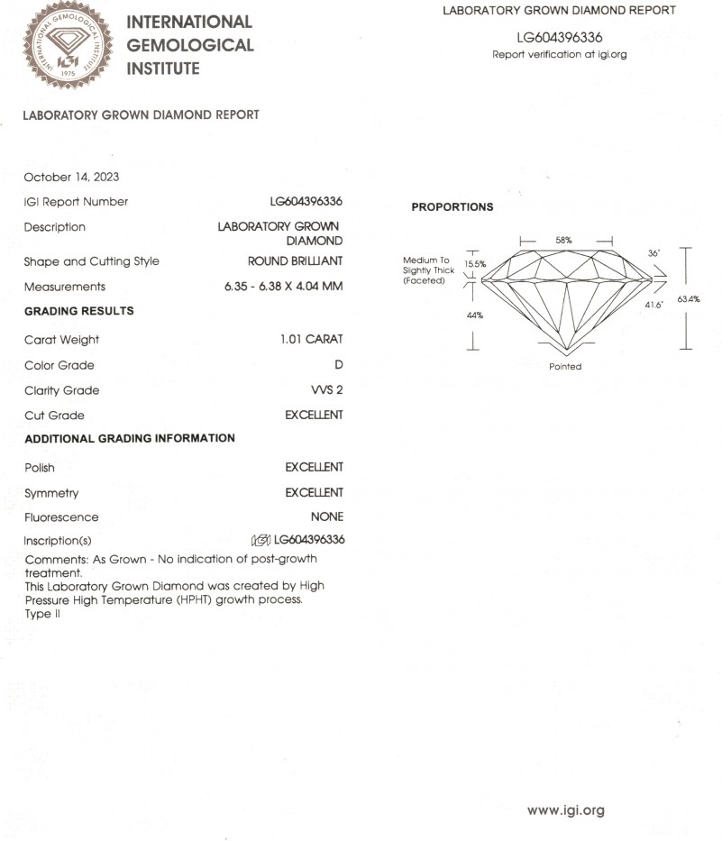 1 бриллиант 1,01 ct. D-VVS2 Excellent Lab Grown Diamond Ø 6,0 мм Labaratory Report LG604396336