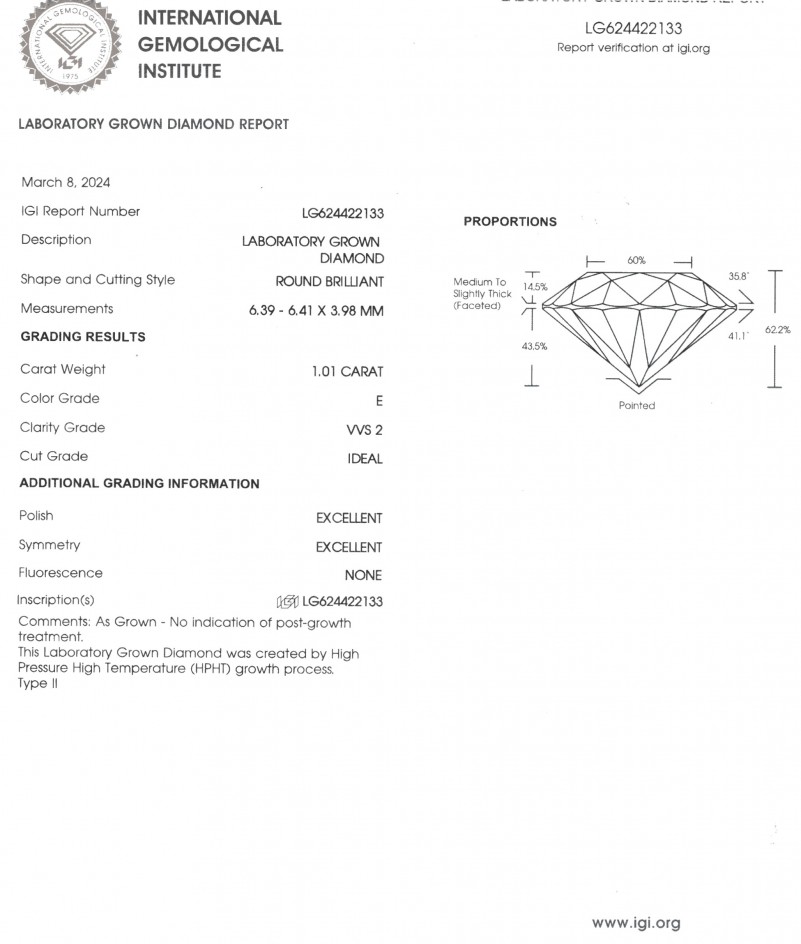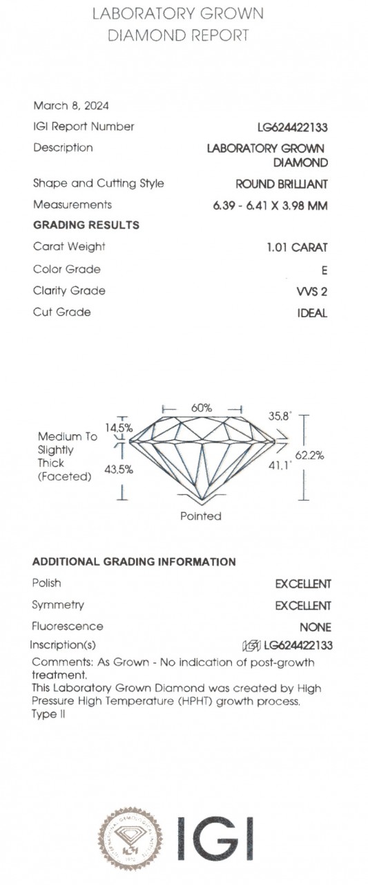 Вставка: 1 бриллиант 1,01 ct. E-VVS2 Ideal, Lab Grown Diamond Ø 6.0 мм Laboratory Report LG624422133