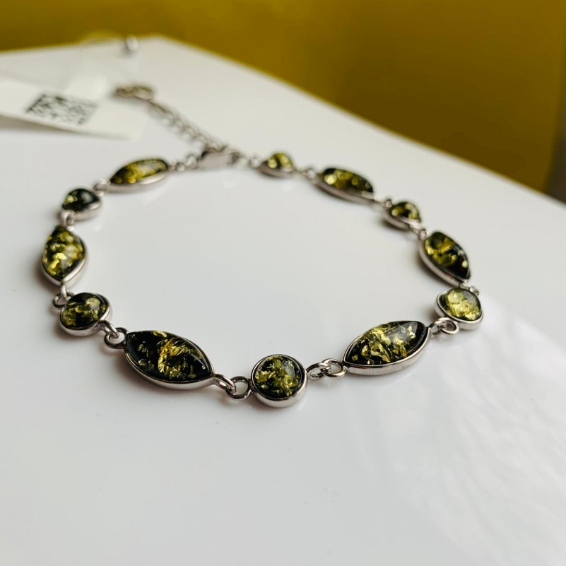Браслет из серебра 925 пробы с зелёным янтарём. Шикарный женственный браслет из серебра 925 пробы, с янтарём, играющим всеми оттенками зелёного цвета, зачаровывая и пленяя своей красотой, будет радовать вас всегда! Уникальная возможность подчеркнуть свою индивидуальность, придать образу женственности, солнечности и нежности.