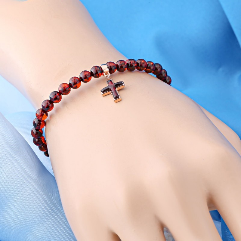 Позолоченный браслет с янтарем и крестом. Браслет из золоченного серебра 925 пробы, с янтарём коньячного цвета и вставкой янтарного креста в позолоченном обрамлении.