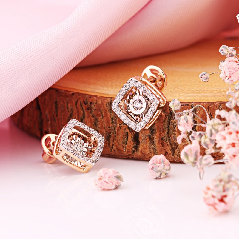 Танцующий бриллиант - очаровательные чувственные серьги пусеты из русского красного золота 585 пробы со сверкающими бриллиантами на фоне из белого золота с алмазной огранкой!