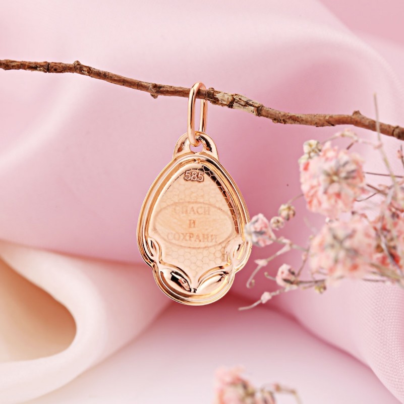 Золотая подвеска-икона. Подвеска-икона из красного русского золота 585 пробы покрытая прозрачной эмалью. В верхней части подвески имеется кольцо для цепочки.