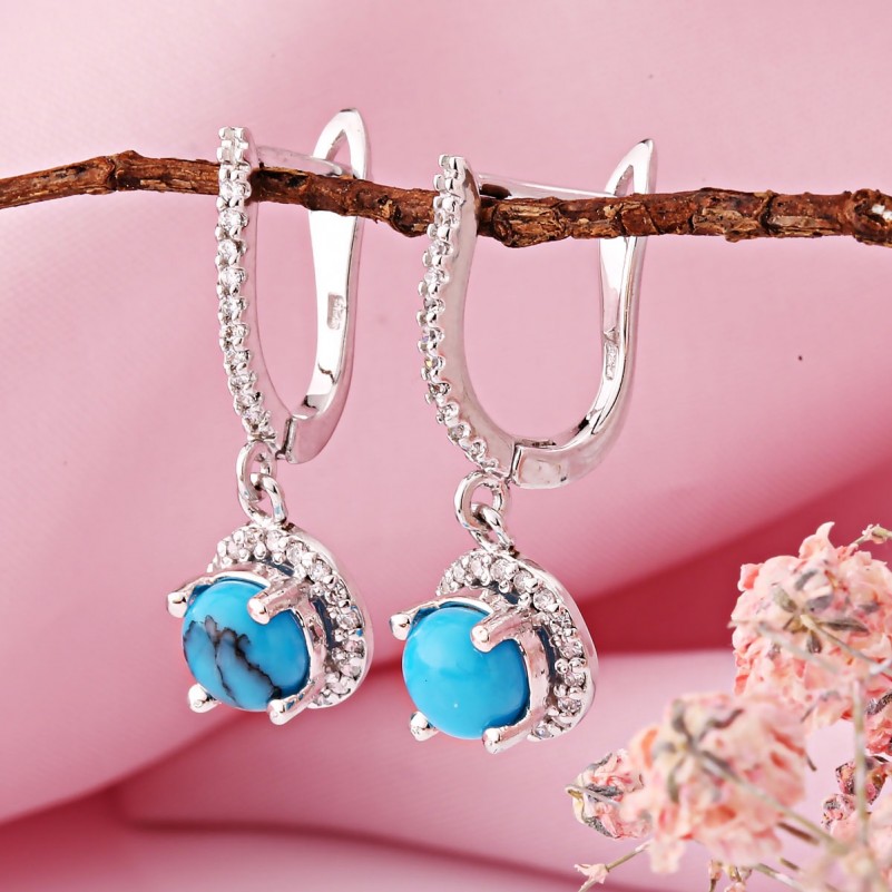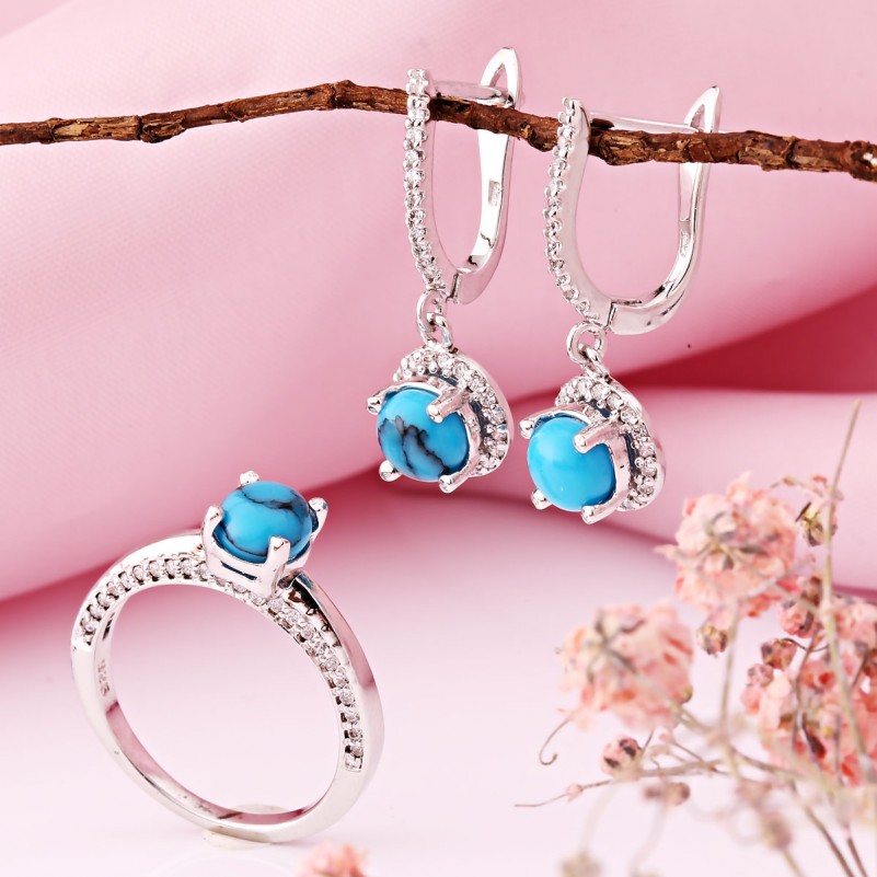 Гарнитур из серебра 925 пробы Бирюза и фианит. Элегантный гарнитур из серебра 925 пробы со вставками очаровательной и нежной бирюзы и сверкающих фианитов, который подчеркнёт вашу индивидуальность и чувство стиля. Набор состоит из подвески, кольца и серёг - подвесок с английским замком.