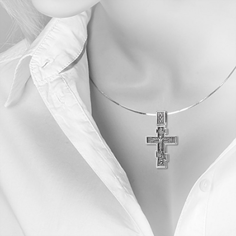 Серебряный крест нательный с распятием из чернёного серебра 925 пробы! На обратной стороне выгравированна молитва. Не царапается при ношении.
