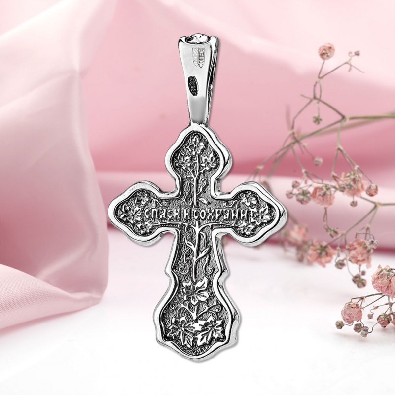 Серебряный крест нательный с распятием из чернёного серебра 925 пробы! На обратной стороне есть молитва: "Спаси и сохрани". Не царапается при ношении.