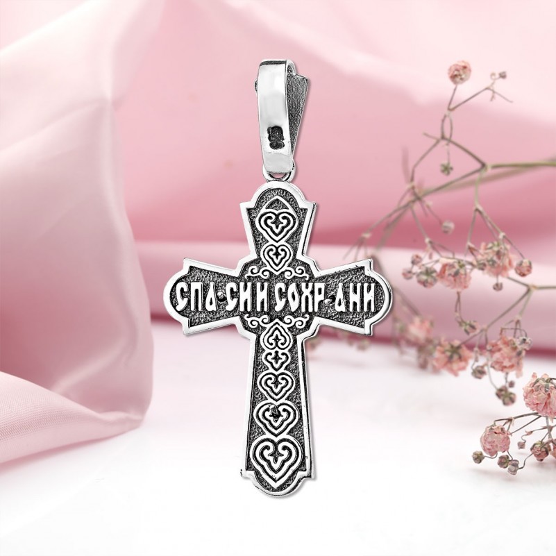 Серебряный крест нательный с распятием из чернёного серебра 925 пробы! На обратной стороне есть молитва: "Спаси и сохрани". Не царапается при ношении.