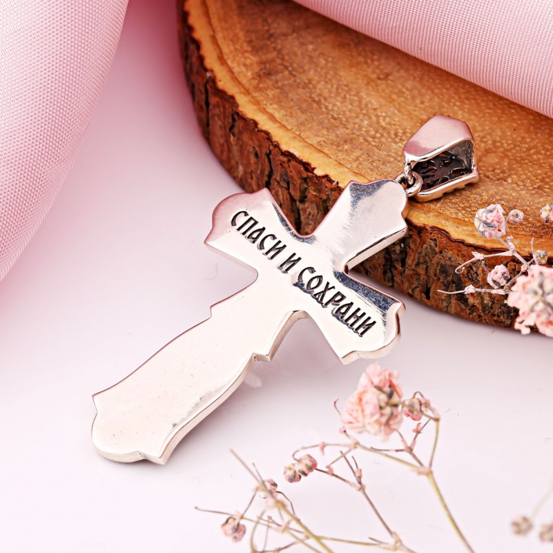 Серебряный крест нательный с распятием из чернёного, оксидированного серебра 925 пробы! На обратной стороне есть молитва: "Спаси и сохрани". Не царапается при ношении.