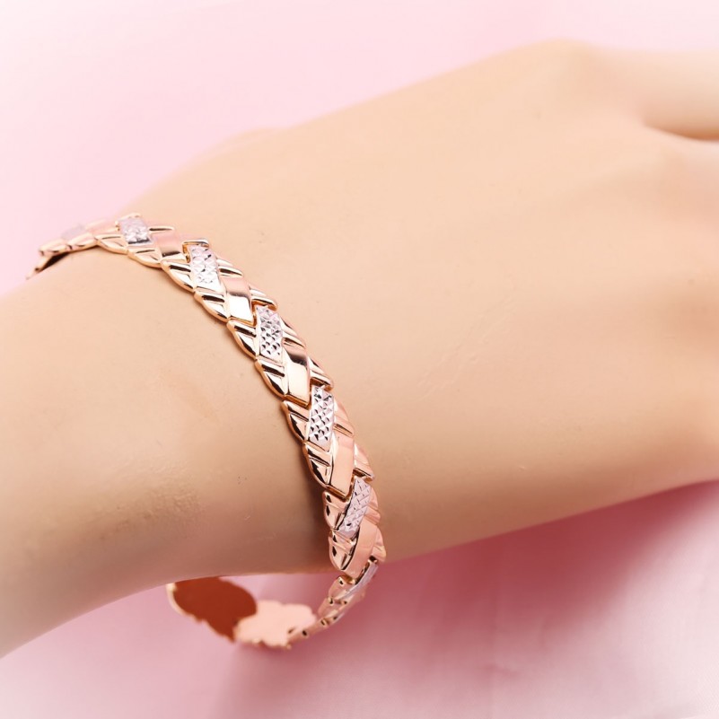 Золотые браслеты женские купить Русское золото 585 браслет с алмазной гранью биколор. Изящный браслет со сверкающей алмазной гранью из белого и красного золота 585-й пробы. Внутренняя часть браслета закрытая, ровная и блестящая. Браслет превосходно украсит как ручку солидной дамы, так и молодой женщины. Браслеты из золота создают необходимый акцент в образе, и привлекают внимание к богатству и роскоши аксессуаров, ведь золото – это красиво, стильно, шикарно, дорого. Данное изделие подчеркнёт Вашу высокую утонченность и глубокое чувство стиля.