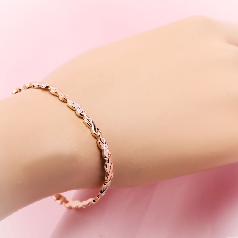Золотые браслеты женские купить Русское золото 585 браслет с алмазной гранью биколор. Изящный браслет со сверкающей алмазной гранью из белого и красного золота 585-й пробы. Внутренняя часть браслета закрытая, ровная и блестящая. Браслет превосходно украсит как ручку солидной дамы, так и молодой женщины. Браслеты из золота создают необходимый акцент в образе, и привлекают внимание к богатству и роскоши аксессуаров, ведь золото – это красиво, стильно, шикарно, дорого. Данное изделие подчеркнёт Вашу высокую утонченность и глубокое чувство стиля.