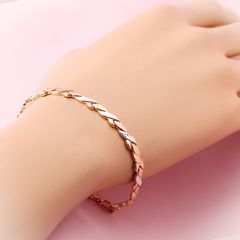 Браслет из русского золота 585 Алмазная грань. Изящный браслет со сверкающей алмазной гранью из белого и красного золота 585-й пробы. Внутренняя часть браслета закрытая, ровная и блестящая. Браслет превосходно украсит как ручку солидной дамы, так и молодой женщины. Браслеты из золота создают необходимый акцент в образе, и привлекают внимание к богатству и роскоши аксессуаров, ведь золото – это красиво, стильно, шикарно, дорого. Данное изделие подчеркнёт Вашу высокую утонченность и глубокое чувство стиля.