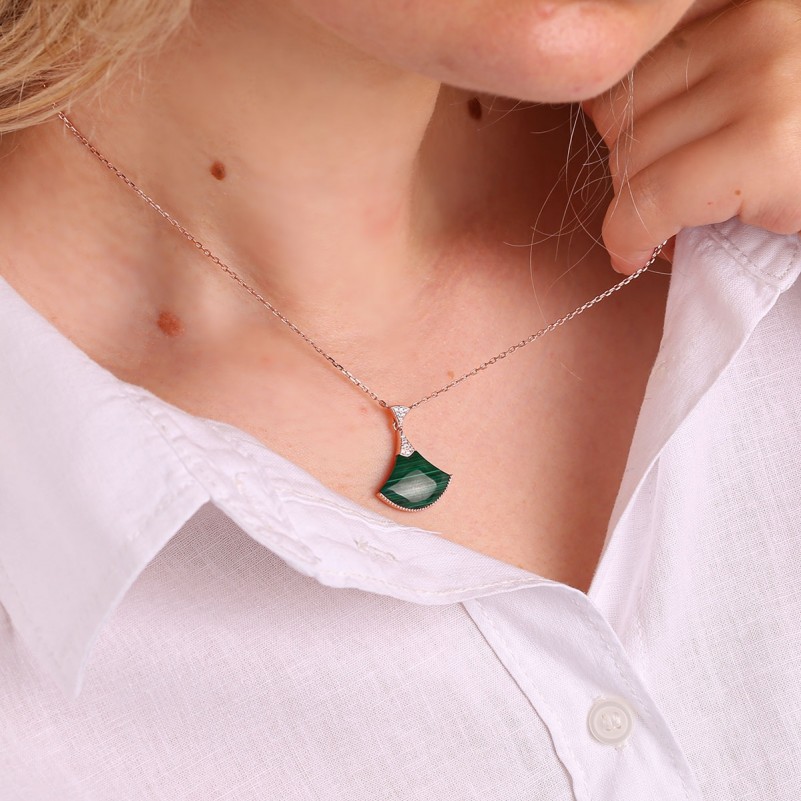 - Малахит — камень с уникальным зелёным оттенком и неповторимой текстурой, который делает каждое украшение уникальным