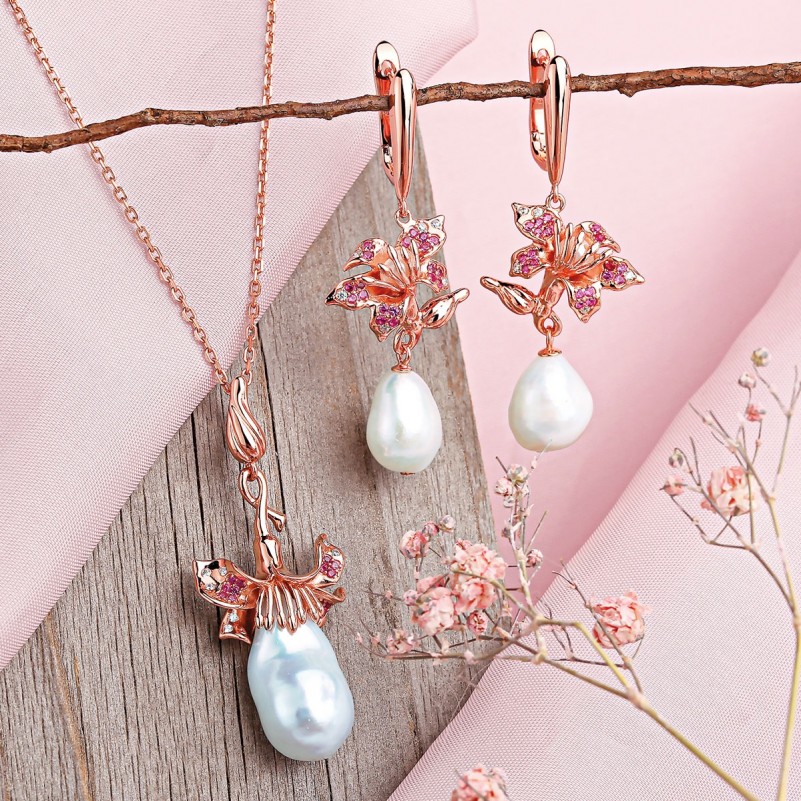 • Жемчуг и разноцветные фианиты создают мерцающий эффект, который привлекает взгляды