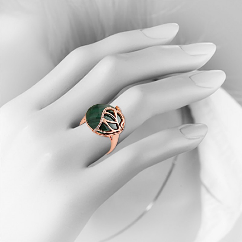 Позолоченные кольца. Позолоченное кольцо с малахитом и фианитами. Сияющее кольцо из серебра 925 пробы с позолотой, украшенное уникальным малахитом и сверкающими фианитами. Подчеркните свою индивидуальность и женственность с аксессуаром, который сразу притягивает восхищённые взгляды.