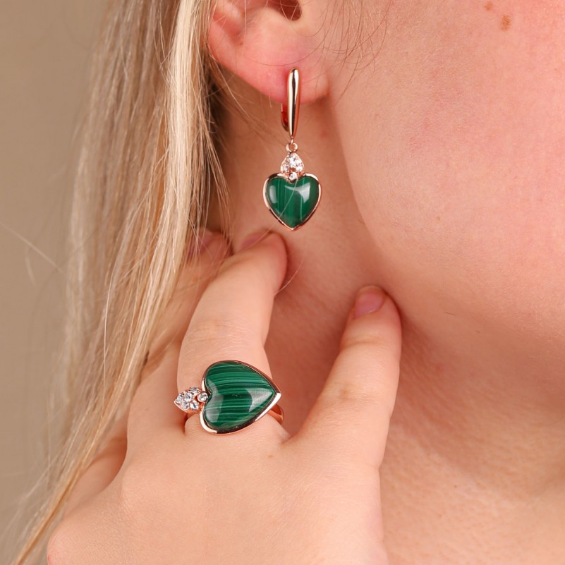 Вставка: 2 Малахит сердце 12.0 х 12.0 мм; 14 фианиты Ø 1.5 мм