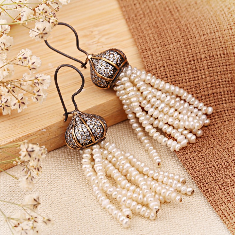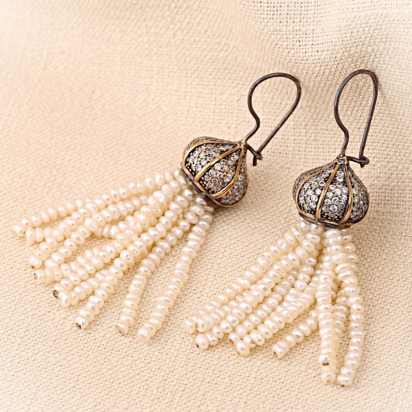 Серьги с жемчугом. Серебряные чернёные серьги - подвески с акцентами из позолоты, украшенные фианитами и природным, искусственно выращенном, жемчугом, растущим в привычных для себя условиях! Очаровательное дополнение к вашему образу в османском стиле! Чудесный подарок для любимой женщины, который вызовет незабываемые эмоции.