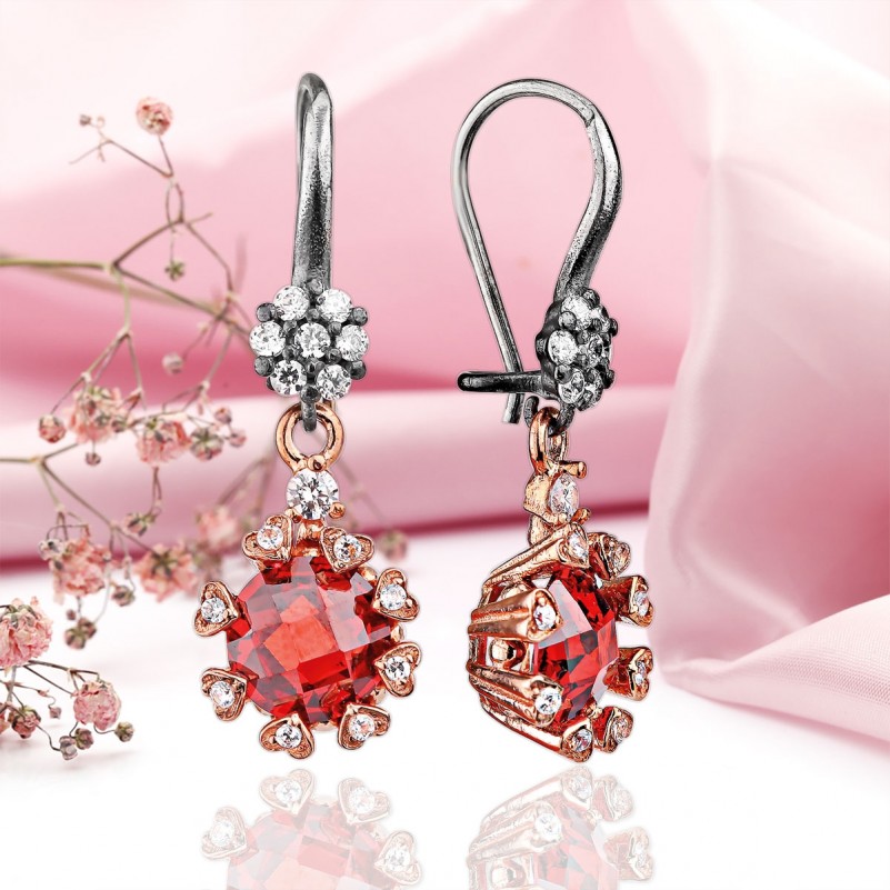 Элегантный гарнитур из серебра 925 пробы с чернением украшен блестящими фианитами с алмазной огранкой в бронзовом обрамлении, что придаёт украшению глубину и выразительность. Центральный элемент каждого изделия — натуральный гранат, который создаёт эффект роскошного контраста с сияющими фианитами.