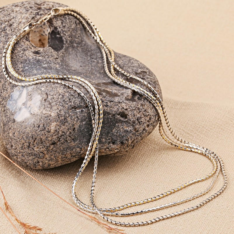 Материал: серебро 925 Плетение: фантазийное Обработка: алмазная огранка Покрытие: чернение, золочение Цвет: серебристый с золотыми и тёмными акцентами Застёжка: карабин Размер: Длина: 45 см/ Ширина: 5.0 мм/ Толщина 1.5 мм Вес: 23,8 г Стиль: классический, дизайнерский