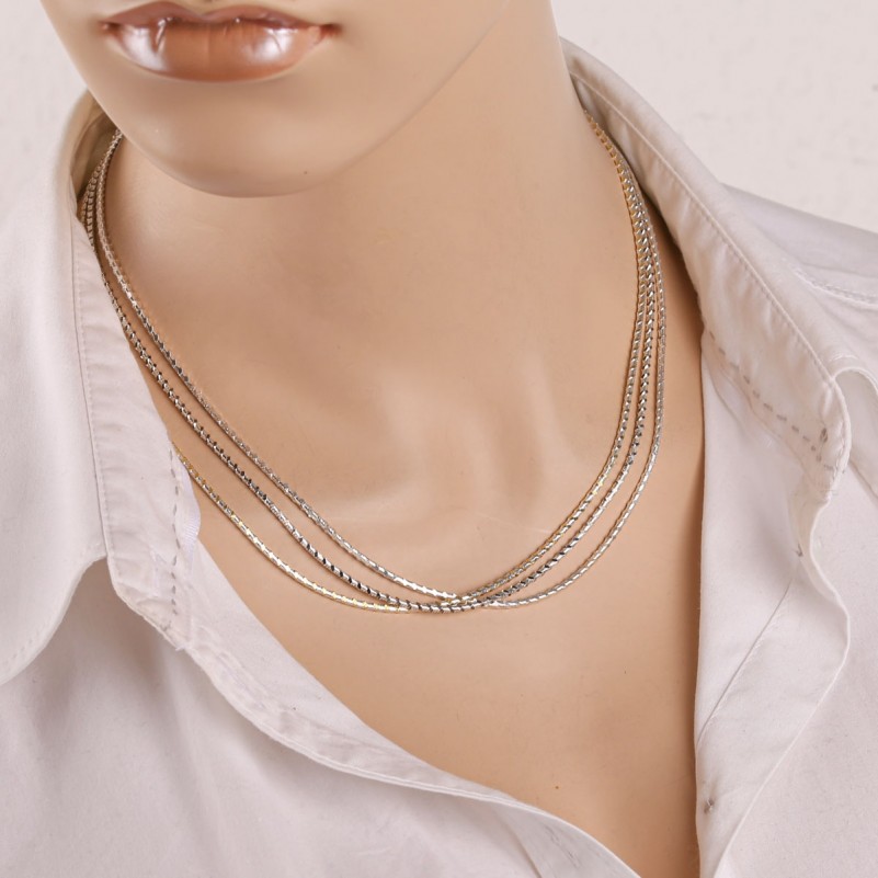 Серебряное колье с алмазной огранкой, чернение и золочение. Элегантное серебряное колье 925 пробы с фантазийным плетением, алмазной огранкой, чернением и золочением. Надёжная застёжка-карабин.