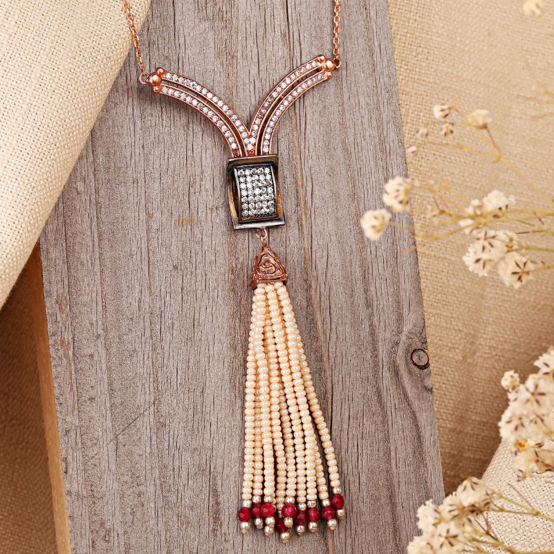 Изысканное колье из серебра 925 пробы выполнено в восточном стиле, сочетая элегантность, роскошь и утончённый восточный шарм. Центральные акценты украшения – рубин (корунд) и искусственно выращенный жемчуг, которые создают эффектный контраст и подчёркивают женственность.