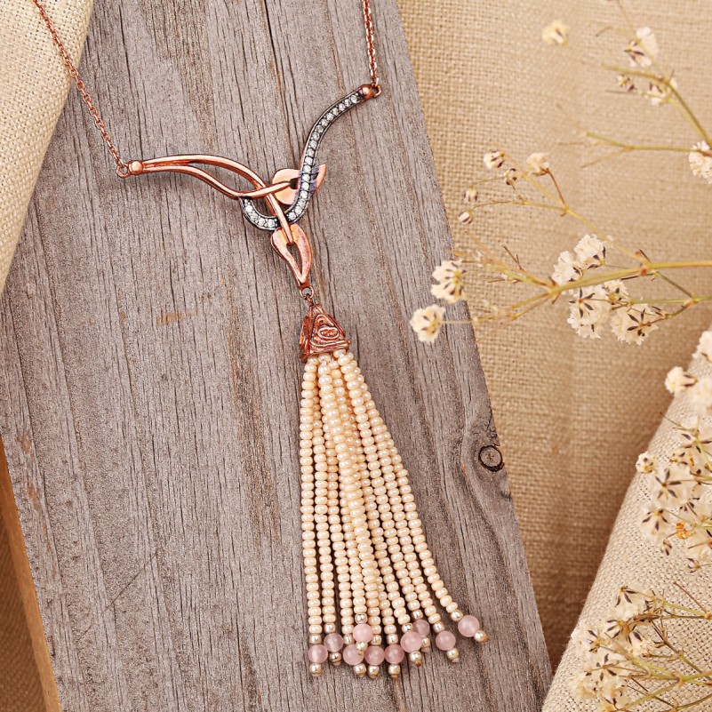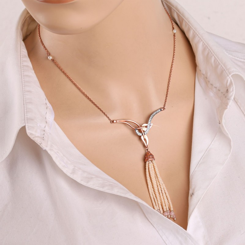 Великолепное колье из серебра 925 пробы, выполненное в восточном стиле, воплощает элегантность, роскошь и утончённый восточный шик. Центральные акценты украшения – розовый кварц и искусственно выращенный жемчуг, создающие гармоничный контраст и подчёркивающие грацию и женственность.