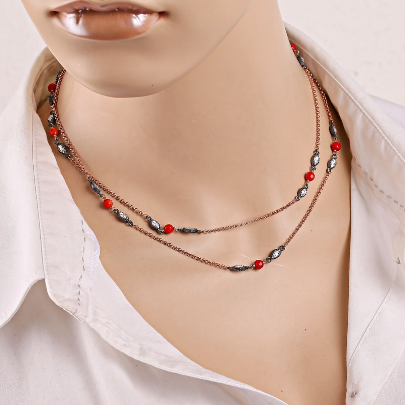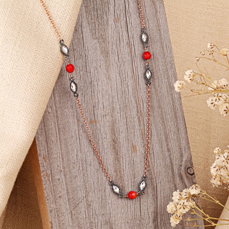 Каждое колье украшено блестящими фианитами с алмазной огранкой, которые переливаются в свете, придавая образу праздничное сияние. Чернение серебра создаёт контраст и объём, а бронзированные детали добавляют тёплый, благородный оттенок и уникальный восточный характер.