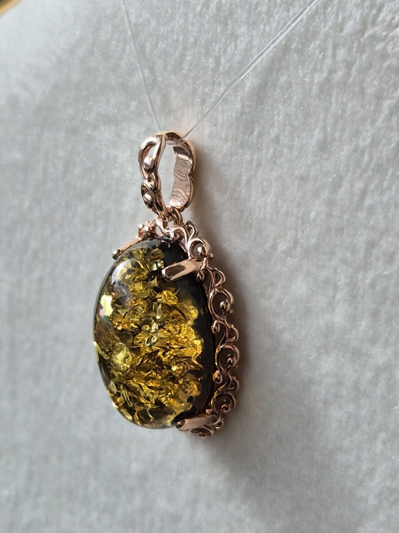 Вставка: 1 зелёный янтарь (овал) – 17,8 × 12,8 мм