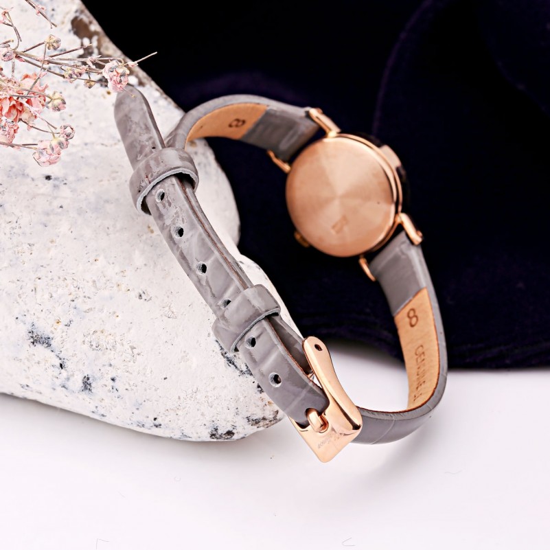 Корпус из красного золота 585 пробы подчеркивает утончённость и престиж модели. Серый циферблат с четкими арабскими цифрами и золотистыми стрелками обеспечивает отличную читаемость, а изящный рельефный безель добавляет образу особого шарма. Ремешок из натуральной кожи серого цвета делает часы комфортными в повседневной носке.