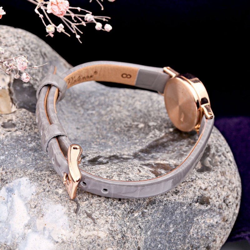 Корпус из красного золота 585 пробы придаёт модели аристократичную элегантность и подчёркивает её статус. Серый циферблат с чёрными римскими цифрами и изящными золотистыми стрелками словно создан для того, чтобы привлекать внимание, а рельефный безель добавляет часам нотку изысканного шарма. Дополняет образ мягкий кожаный ремешок благородного серого оттенка, дарящий комфорт каждый день.