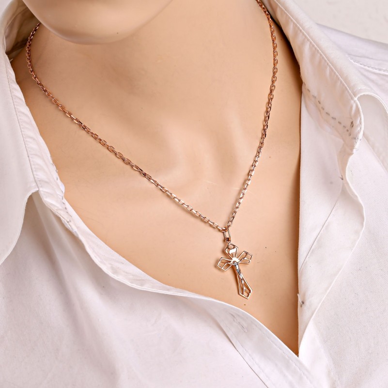 Золотое колье с крестиком. Узорчатый крестик выполнен из красного золота 585 пробы с распятием из белого золота 585 пробы. На обратной стороне указана проба золота, подтверждающая подлинность изделия.