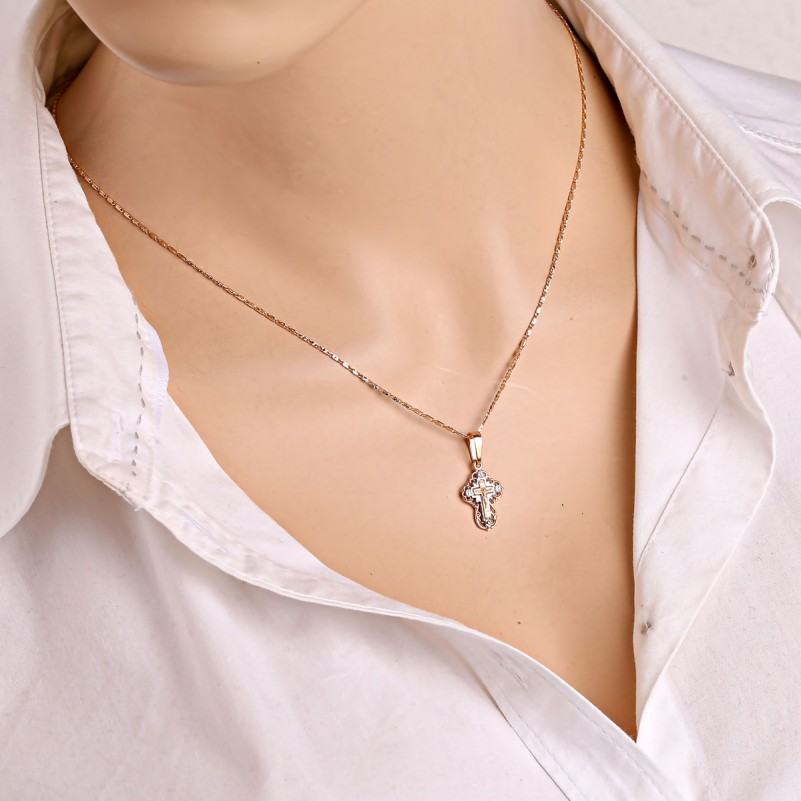 Золотое колье 585 с крестиком. Ажурный крест с распятием из красного золота 585 пробы c акцентами из белого золота 585 пробы. На обороте — гравировка молитвы «Спаси и сохрани». Колье с оригинальной цепочкой плетения «фантазия» и алмазной огранкой, которая сияет при движении, подчёркивая изысканный блеск украшения. Благодаря сложной структуре и художественному исполнению, фантазийное плетение выглядит выразительно даже без подвески и идеально подходит для самостоятельного ношения. Такие цепочки сочетают в себе прочность, гибкость и эстетическую гармонию, подчёркивая индивидуальность владельца и изысканность вкуса.