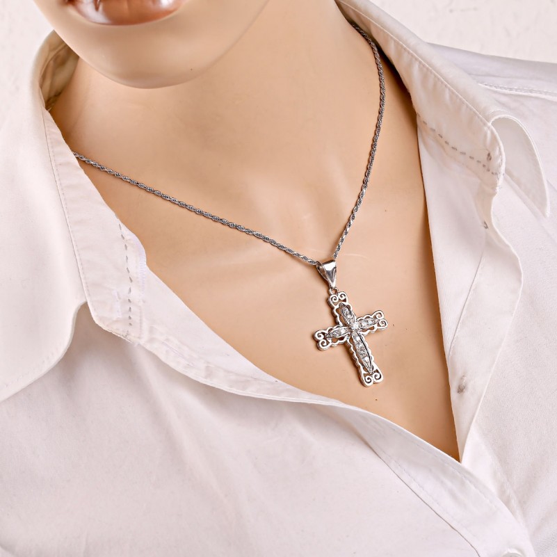 Крупный крест выполнен из серебра 925 пробы без распятия и декорирован фианитами, придающими изделию лёгкое свечение и утончённый вид.Сдержанный дизайн и качественная обработка позволяют сочетать колье с повседневными и нарядными образами.