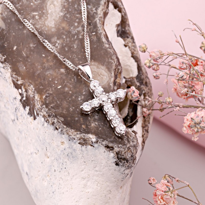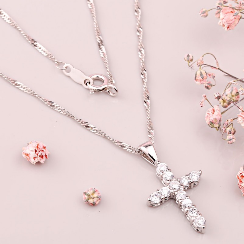 Крест без распятия изготовлен из серебра 925 пробы и украшен фианитами, придающими изделию мягкое, утончённое сияние. Сдержанный силуэт и аккуратное исполнение делают колье уместным как в повседневных образах, так и при торжественных событиях.