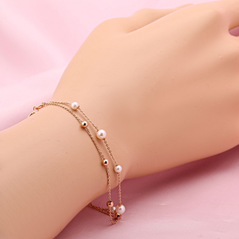 Две тонкие цепочки красиво переливаются и создают эффект многослойности, а равномерно расположенные элементы — нежный культивированный жемчуг и зеркально полированные золотые шарики — формируют гармоничный ритм и благородный блеск. Жемчуг добавляет образу мягкости и женственности, а золотые элементы — выразительности.