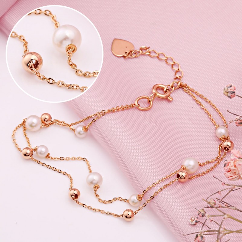 Золотой браслет с жемчугом цена. Нежный двухрядный браслет из красного золота 585 пробы с культивированным жемчугом и золотыми шариками — это украшение, созданное для тех, кто любит утончённую, светлую и элегантную роскошь.
