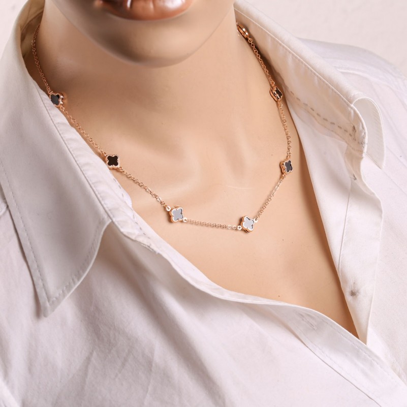 Тонкая цепочка Бельцер нежно подчёркивает линию шеи, а аккуратные вставки из глубокого чёрного оникса, оформленные в форме четырёхлистника, создают стильный контраст с тёплым сиянием золота.