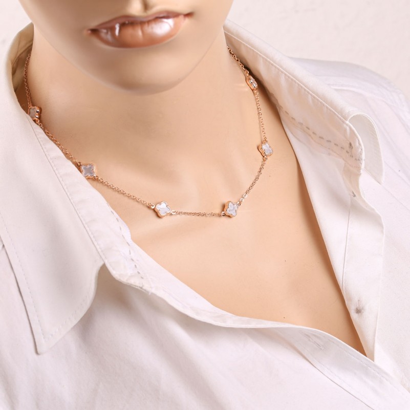 Изящная цепочка Бельцер мягко подчёркивает линию шеи, а миниатюрные вставки из переливчатого перламутра в форме четырёхлистника создают образ лёгкости, чистоты и нежного сияния.