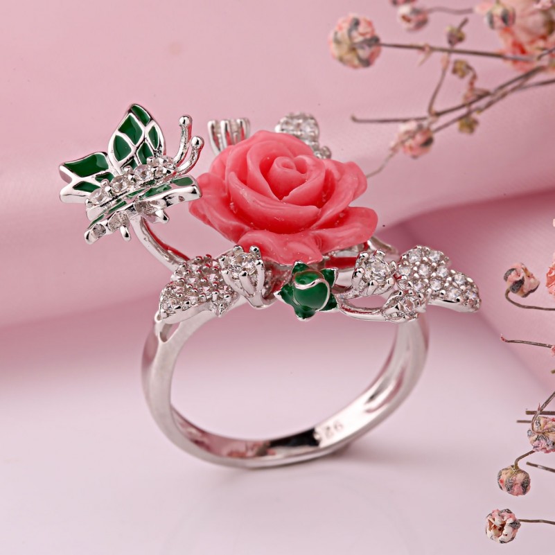 В центре композиции — объёмная роза из натурального коралла. Её мягкий розовый оттенок придаёт украшению теплоту и живость, а плавные линии лепестков создают ощущение настоящего цветка. Вокруг бутона изящно переплетаются серебряные ветви, инкрустированные фианитами, которые добавляют деликатное сияние.