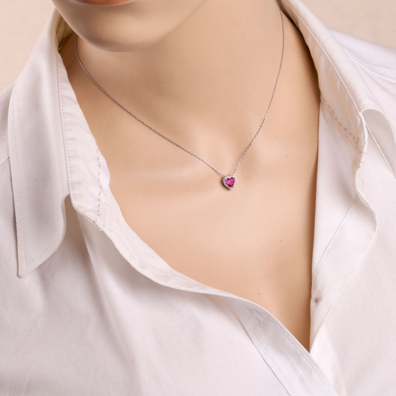 Купить колье Серебро 925. Нежное колье из серебра 925 с фианитами в форме сердца — изящное украшение, которое символизирует любовь, теплоту и романтику. Центральный элемент выполнен в виде сердца с рубиновым фианитом, сияние которого красиво подчёркивают маленькие белые фианиты по контуру.